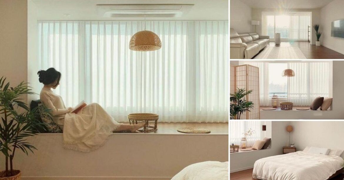 In an alcove before the window, some storage space has been concealed, so that it doesn’t hamper the aesthetic of the home.